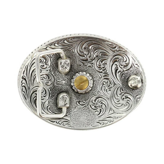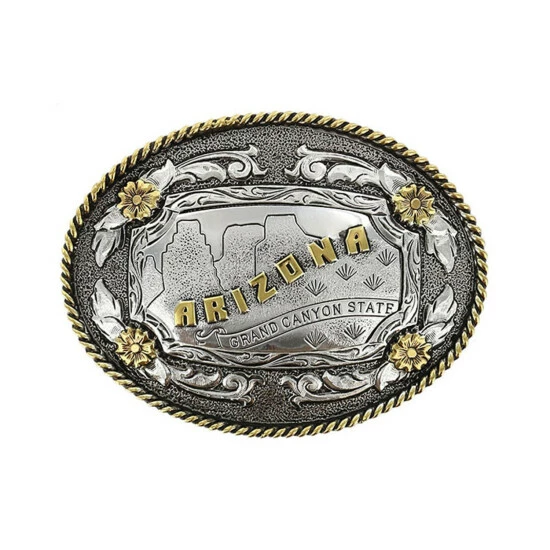 If you love Arizona, you’ll love this belt buckle by Cody James. Featuring a gold and silver tone finish, this buckle has “Arizona” and “Grand Canyon State” lettering across the front atop a Grand Canyon imagery background. Floral details and twisted rope trim complete the look. Pair this bold buckle with your favorite outfit for a night on the town and put your state pride on display.
