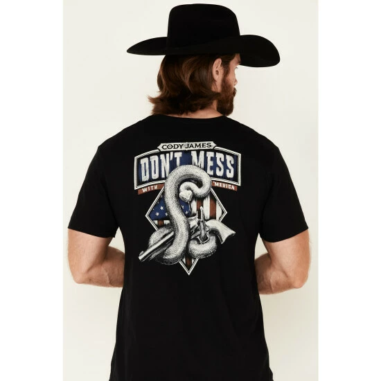 - “Cody James Don’t Mess With “Merica” with American flag & snake wrapped revolver graphic on back