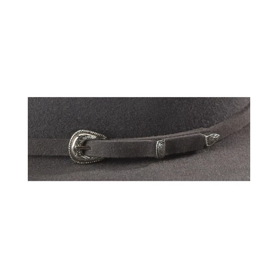 - Decorative hat band with etched three-piece silver-tone buckle set