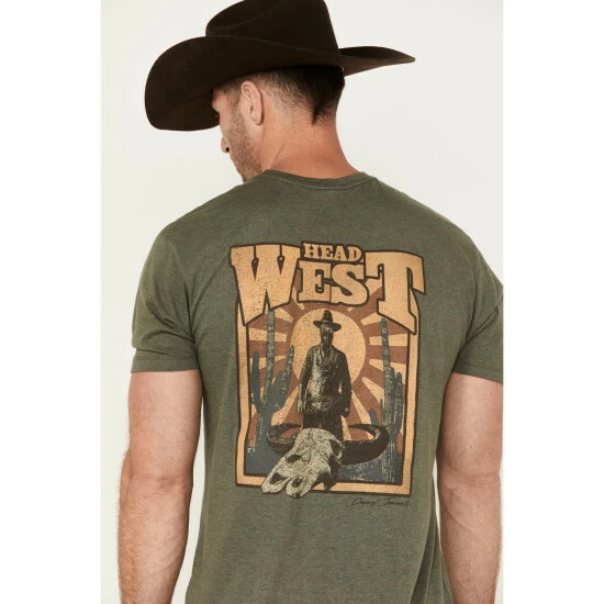- “Head West” with cowboy desert scene and steer head skull graphic on back
